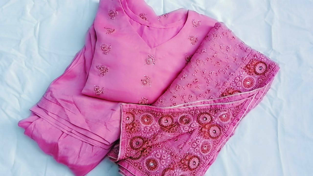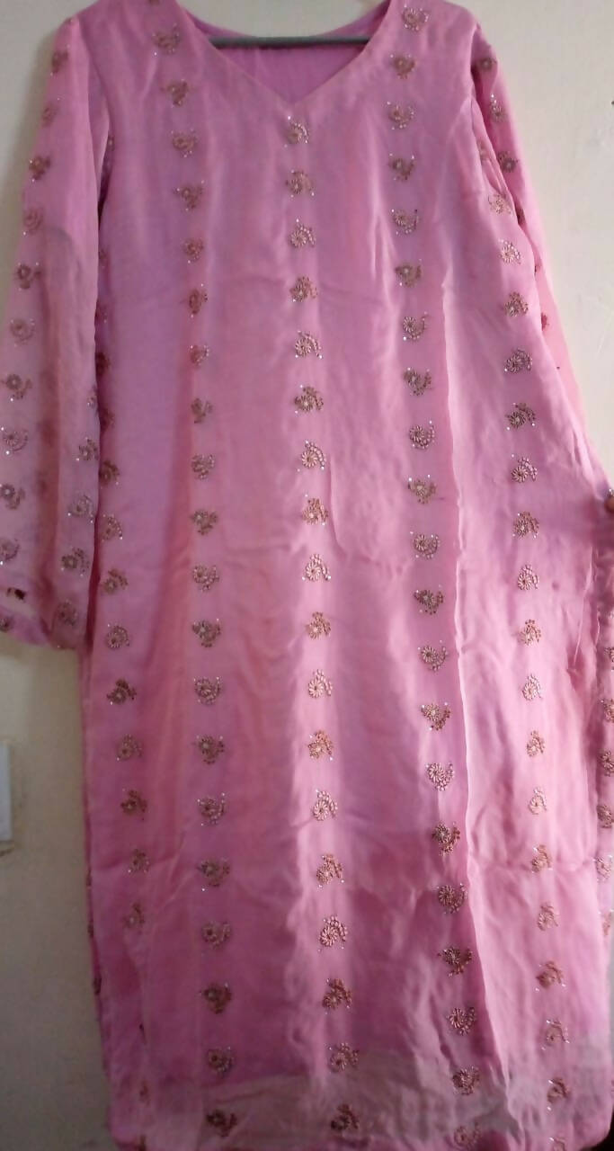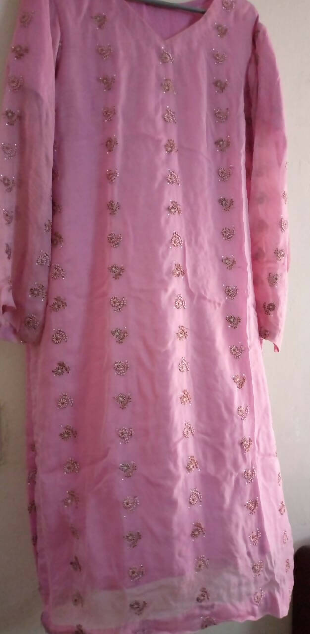 | MATERIAL & MEASUREMENT | Chiffon embroidery & small stone Length;44 Chest:22 Shoulder:16 Sleeves:22 Shalwar:40 |