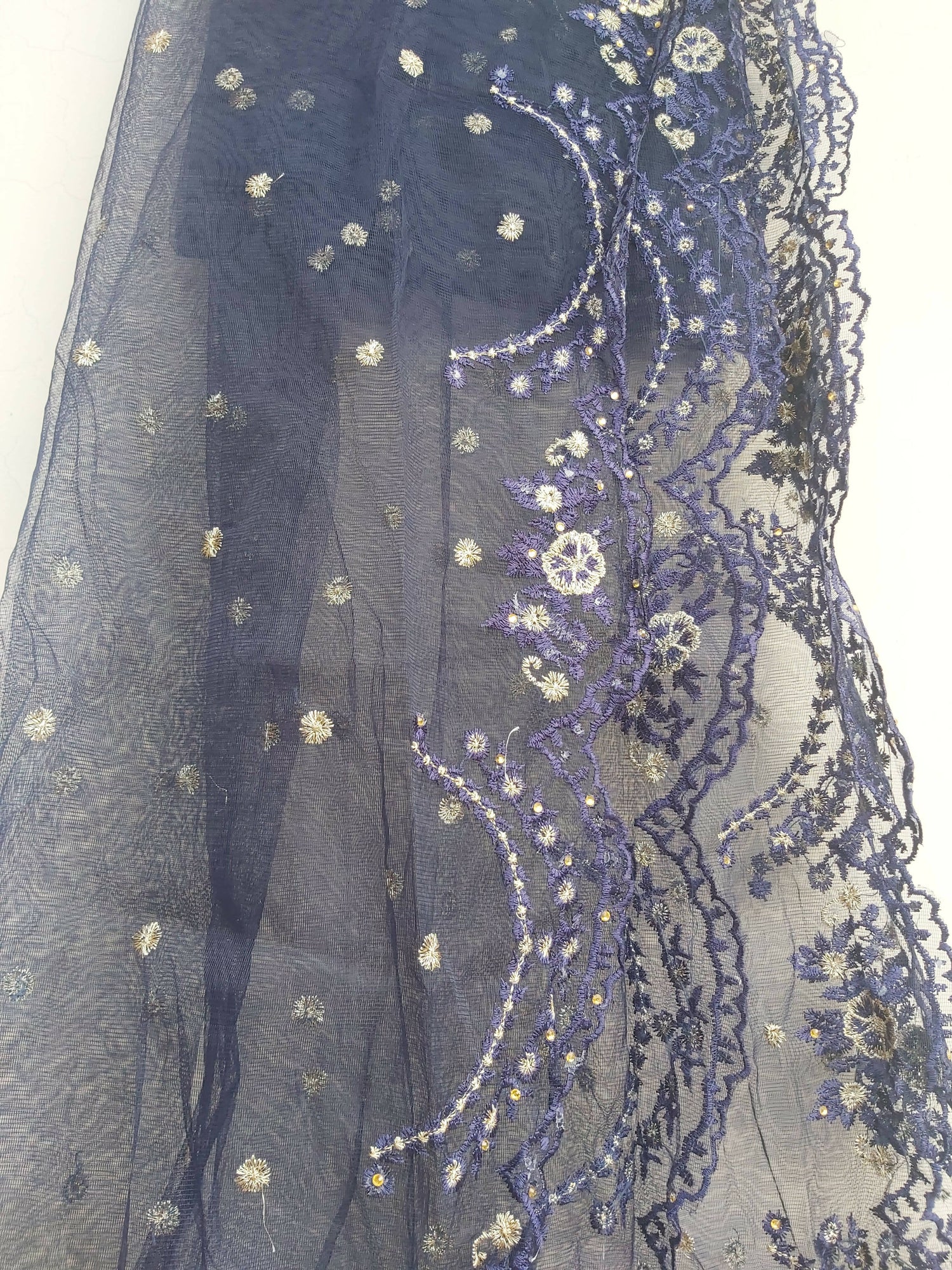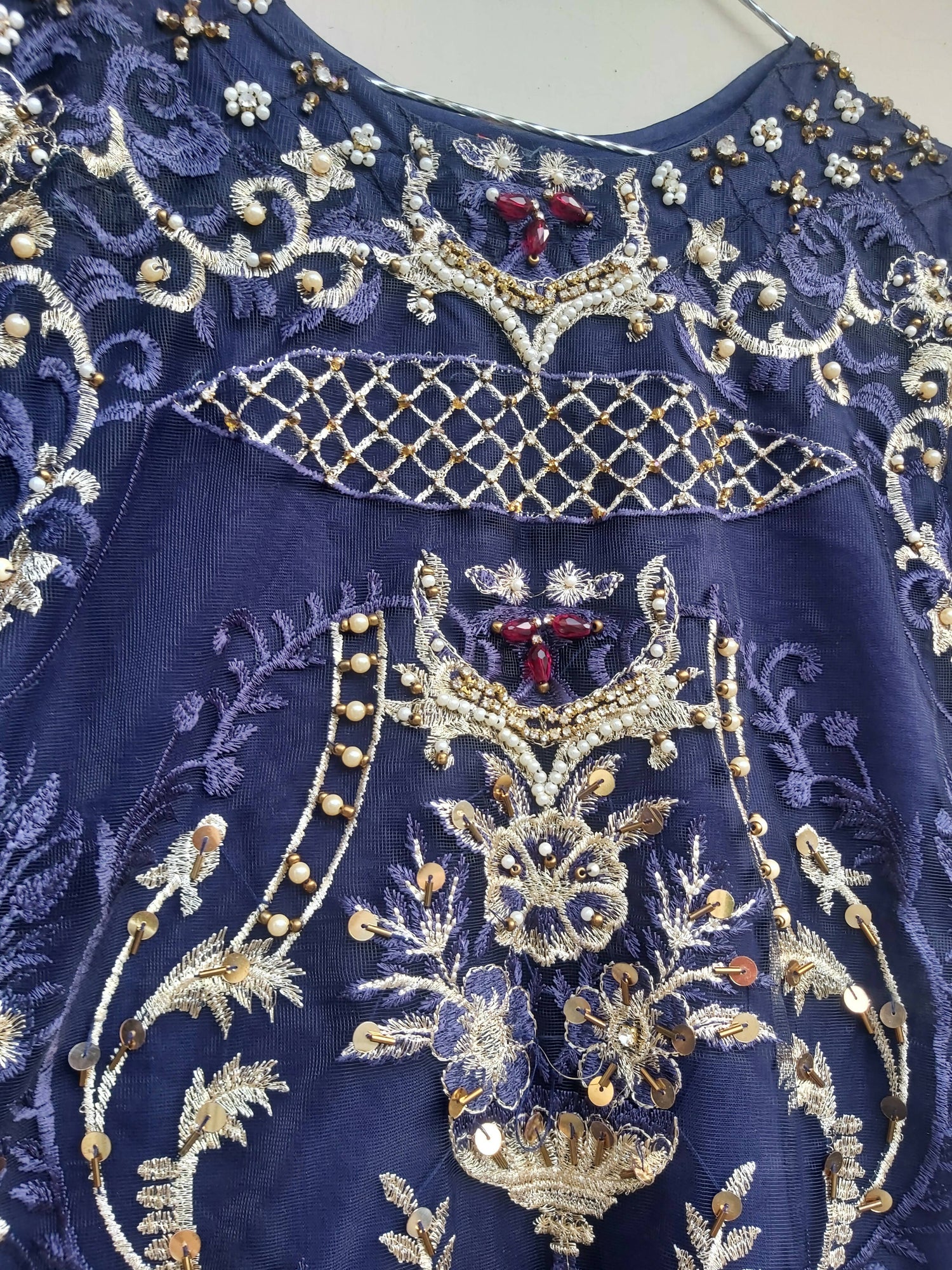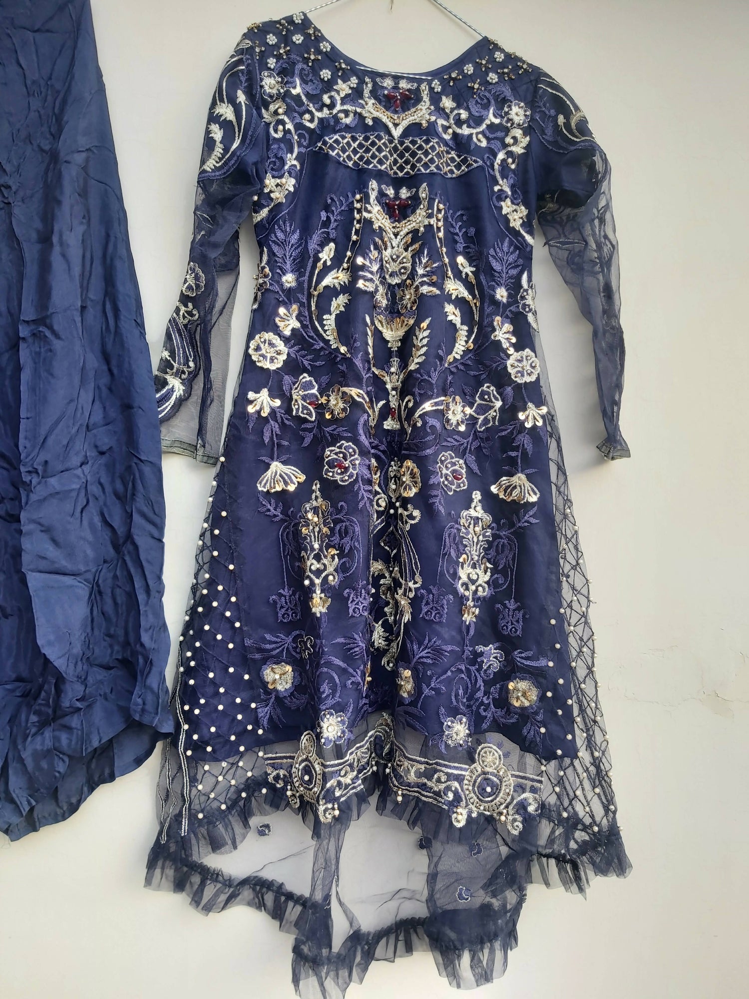 | MATERIAL & MEASUREMENT | Colour : nevy blue back tale frock Fabric: net / inner krinkle cryp Mesurments Plazo : 47 Frock front length : 51 Back tale : 61 Chest : 23 |