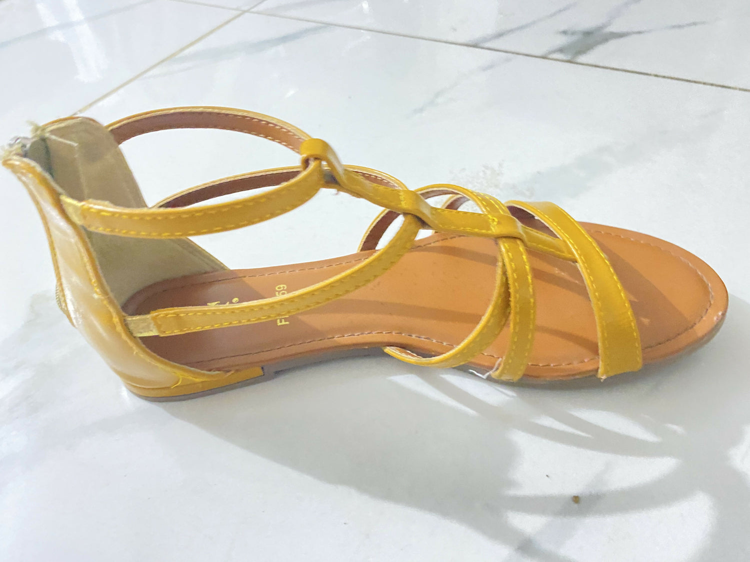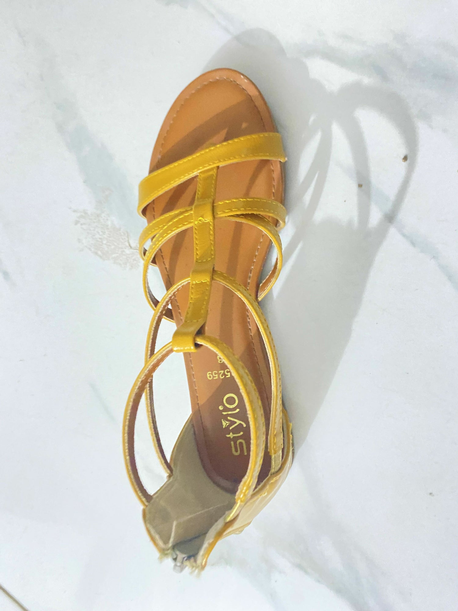 Bright and fashionable open-toe sandal designed by Stylo. Features a multi-strap pattern in vibrant yellow, a flat sole, and a back zipper for secure fitting. Ideal for casual summer outings or everyday wear.