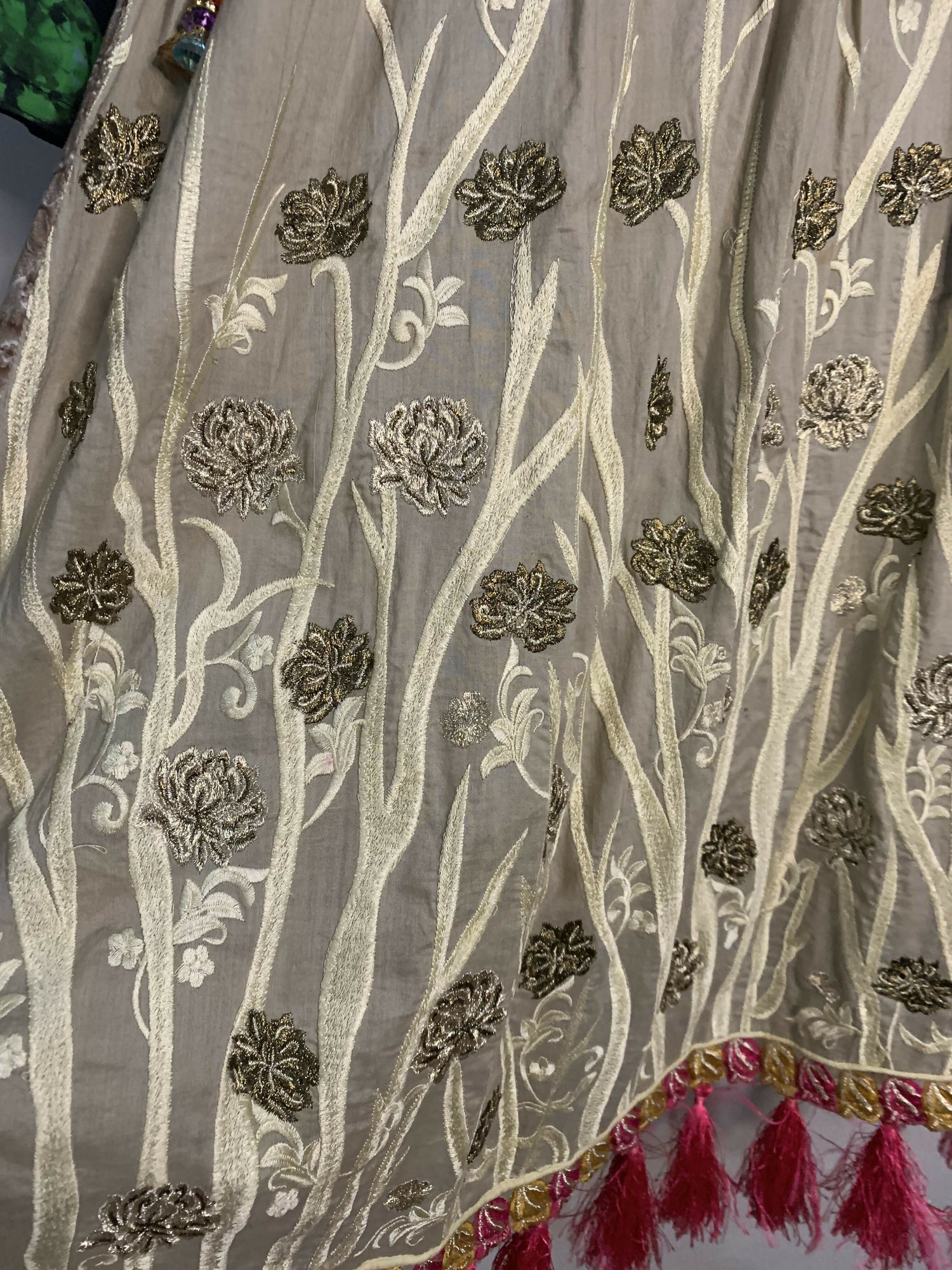 | MATERIAL & MEASUREMENT | Lawn 3 pice frock dupatta and trouser complete dress fully frock front embroidery with tussles condition almost new 10/10 |