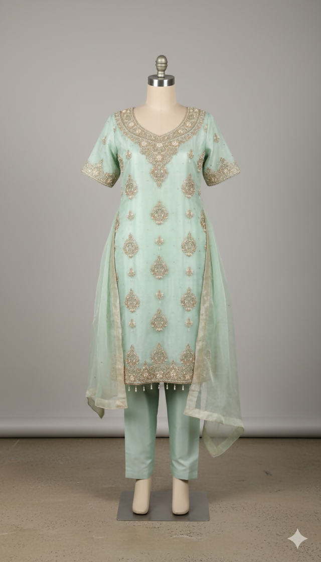 | MATERIAL & MEASUREMENT | Measurement : Shoulder: 16 Chest: 21 Ghera: 25 Length: 38 Sleeves length: 17 Trouser: 37 |
