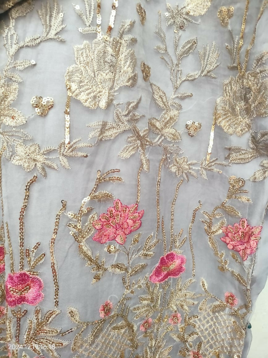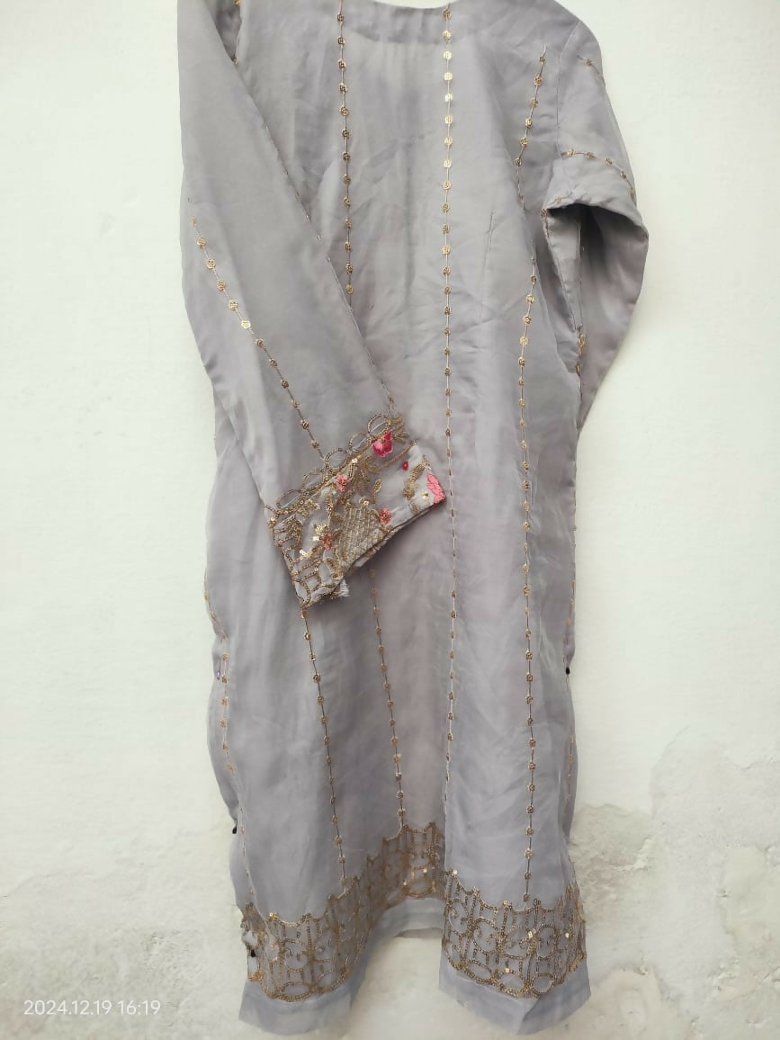 MATERIAL & MEASUREMENT Fabric: Soft Organza Color: Light Gray Measurements Shoulder: 13.5 Chest: 20.5 Hip: 21.5 Bazo Length: 21.5 Shirt Length: 40.5