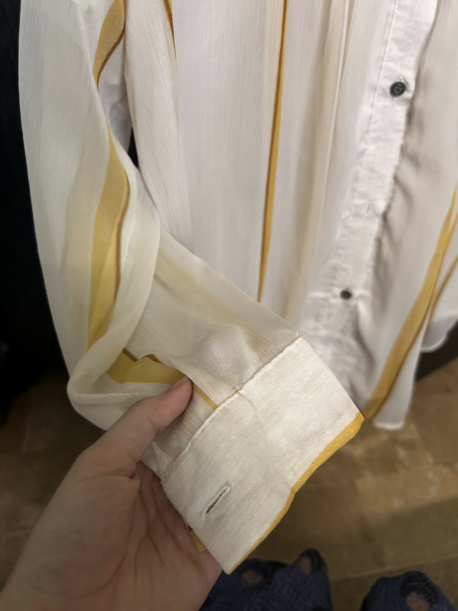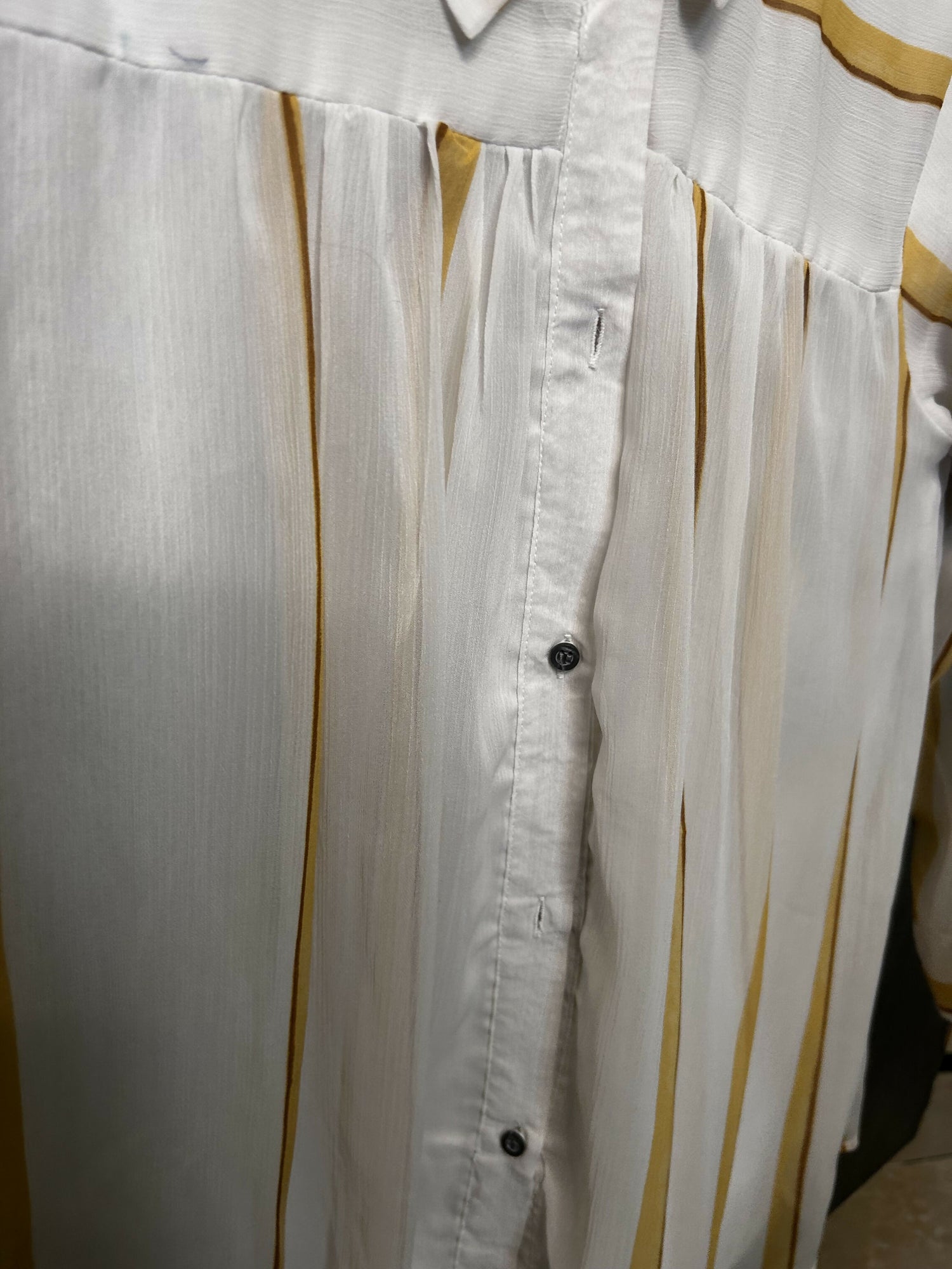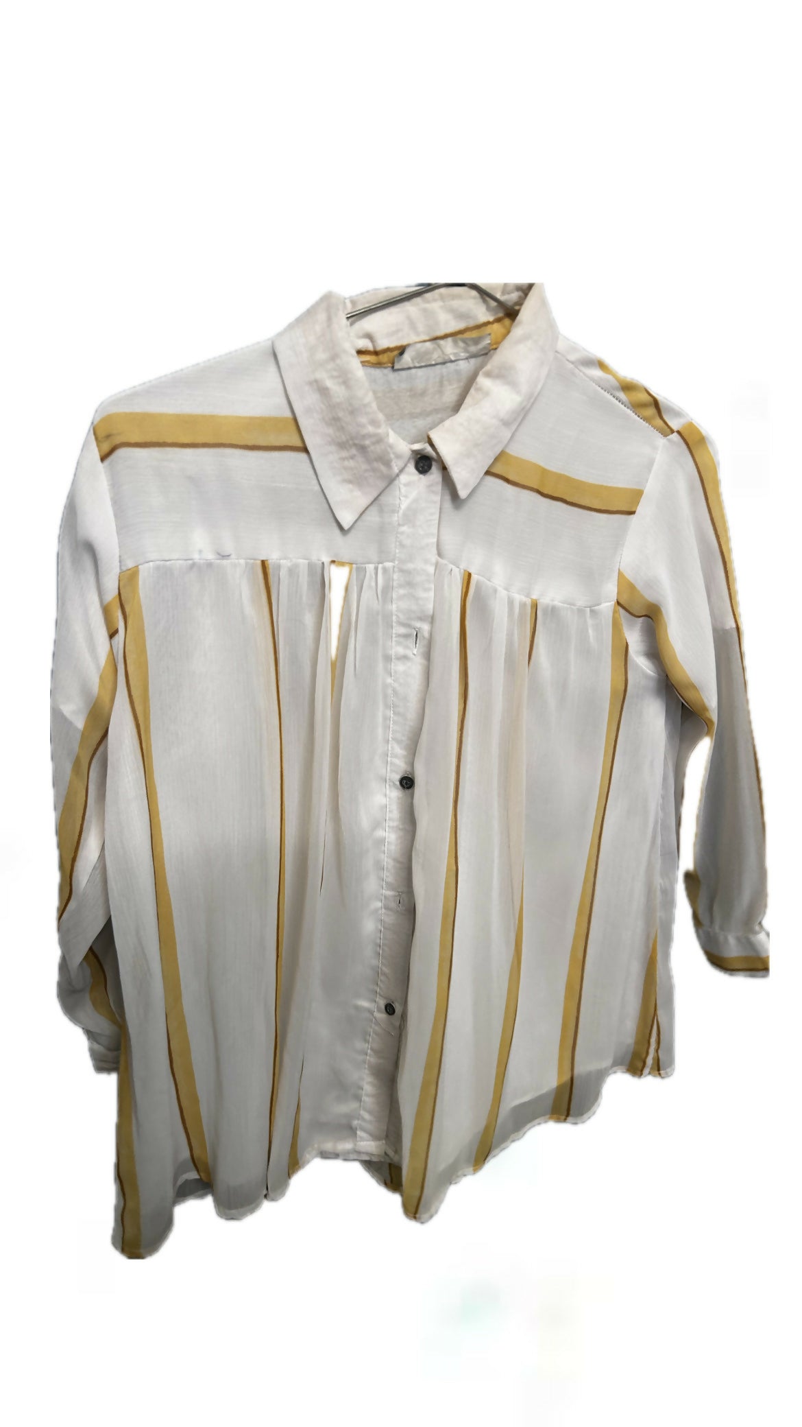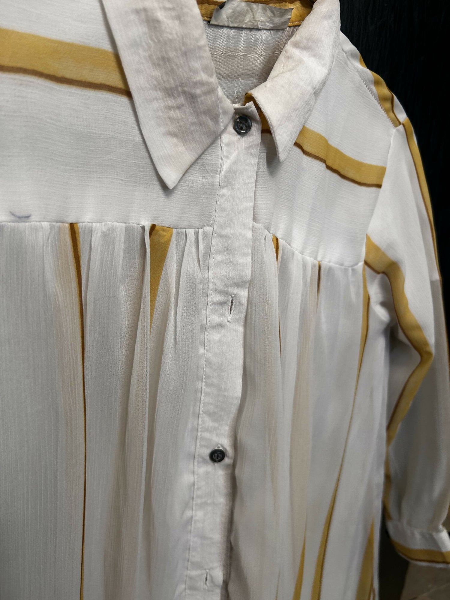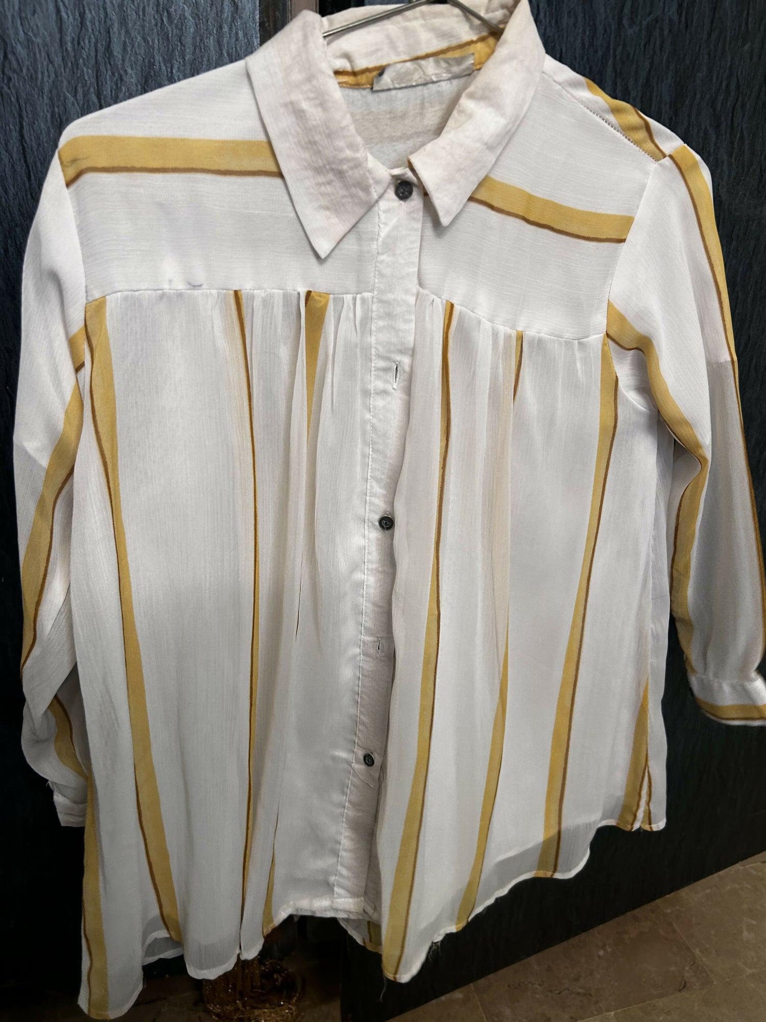 | MATERIAL & MEASUREMENT | Color: White base with mustard yellow vertical stripes • Neckline: Collared neck • Front: Button-down closure • Sleeves: 3/4 length with button cuffs • Pattern: Vertical stripes • Fit: Loose fit with pleated front for a flowy silhouette • Material: Lightweight, semi-sheer fabric (likely polyester or a polyester-blend) • Style: Casual, semi-formal, office wear Chest (Pit to Pit): 19.5 inches • Length (Shoulder to Hem): 25.5 inches • Shoulder Width: 15 inches • Sleeve Length (from Shoulder): 18 inches |